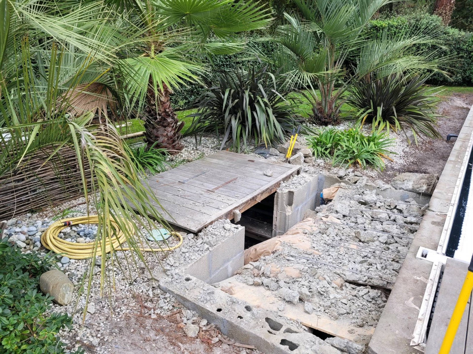 Notre approche était donc claire. Il fallait casser la dalle existante qui servait de plafond pour ce local technique et rehausser les murs existants en parpaings pour y poser et couler un plancher en hourdis. Ce dernier devrait être plus haut et permettre au client de tenir debout à l'intérieur de la pièce pour y effectuer l’entretien de sa piscine. Nous avons ensuite appliqué un goudron d'étanchéité sur la face extérieure du parpaing en guise de finition. Cependant, l'ensemble sera recouvert par du bois et créera ainsi une plage surélevée comme souhaitée par notre client.