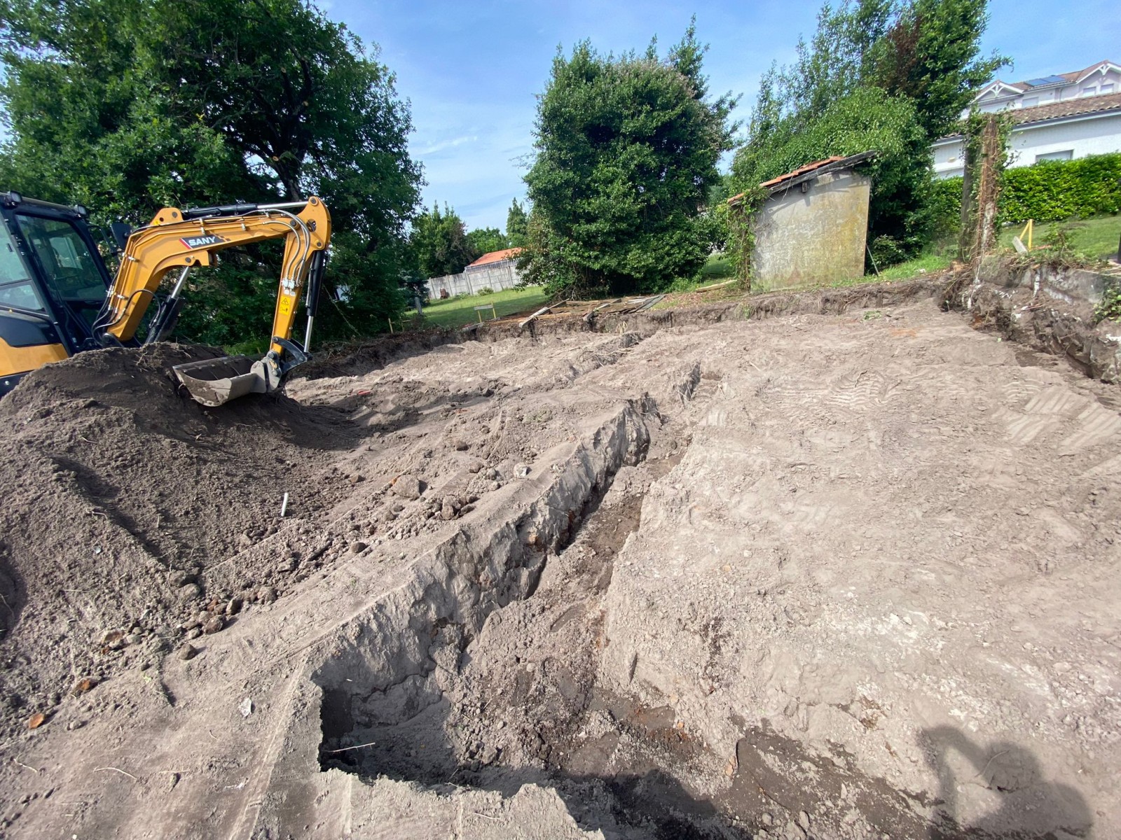 Le chantier a débuté par un décaissement complet du sol, suivi de l'extraction de la terre pour permettre la mise en place des fondations. Un ferraillage minutieux a été réalisé avant le coulage du béton, assurant ainsi la solidité et la durabilité de la structure.